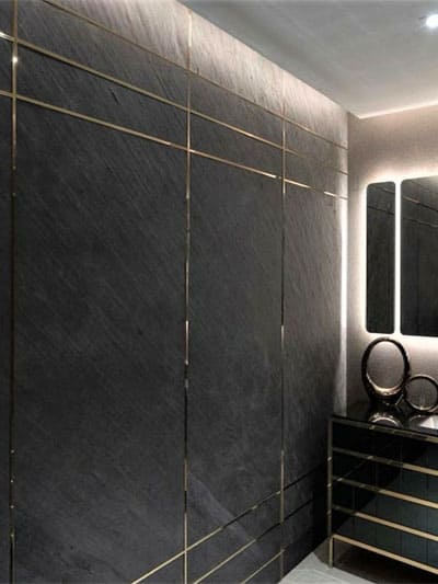 Колір кам’яного шпону Black із глибокими темними відтінками дарує інтер’єру сучасний та елегантний вигляд. Завдяки природній текстурі цей матеріал відмінно підходить для оздоблення як вертикальних, так і горизонтальних поверхонь. Він надає інтер’єру стриманість та стиль, створюючи атмосферу вишуканої простоти.